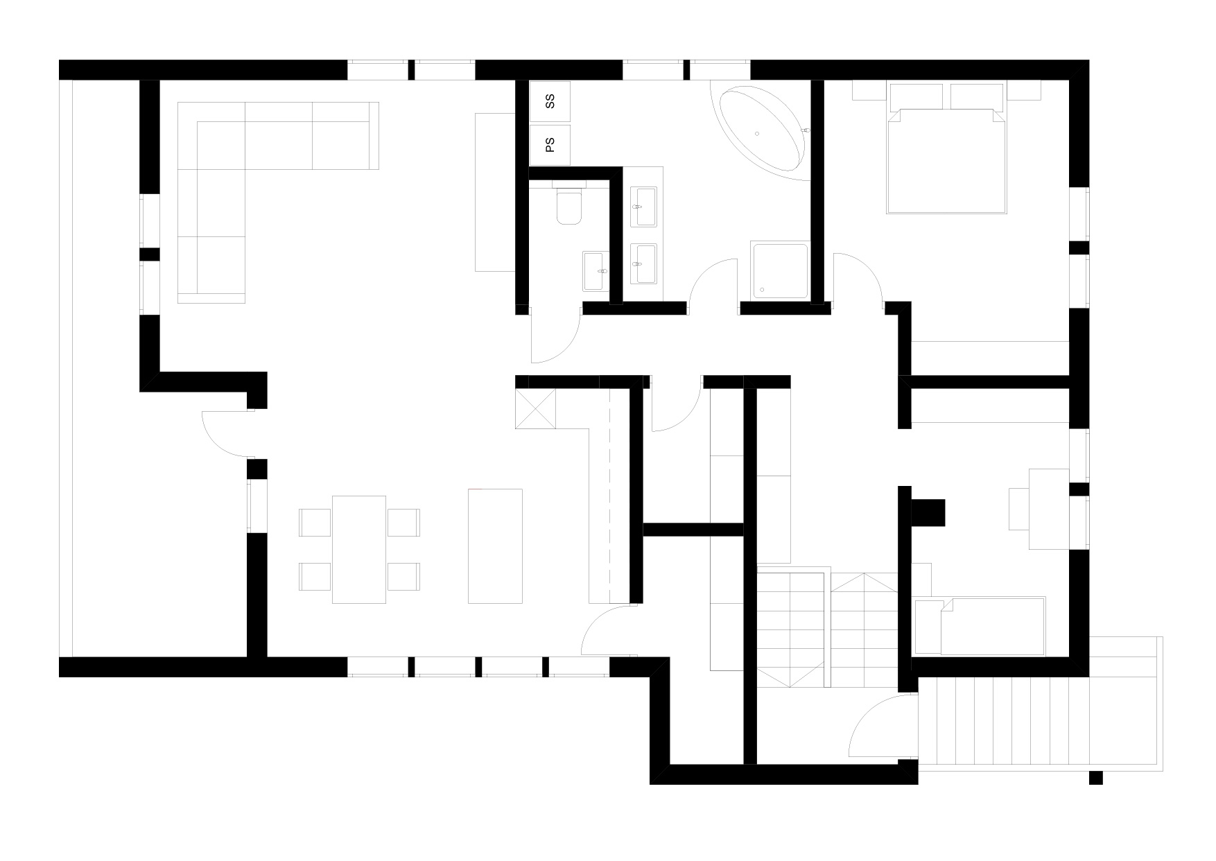 Po prvem ogledu smo se dogovorili, da se bodo izvedle tudi določene rušitve obstoječih sten. S tem smo si ustvarili podlogo za ustvarjanje odprtega tlorisa in zračnih prostorov. V tlorisni zasnovi smo se osredotočali na povezavo med dnevnim prostorom, kuhinjo in jedilnico. Ostale prostore smo skrbno načrtovali, da smo v čim večji meri izkoristili vse površine, ki smo jih imeli na razpolago.
